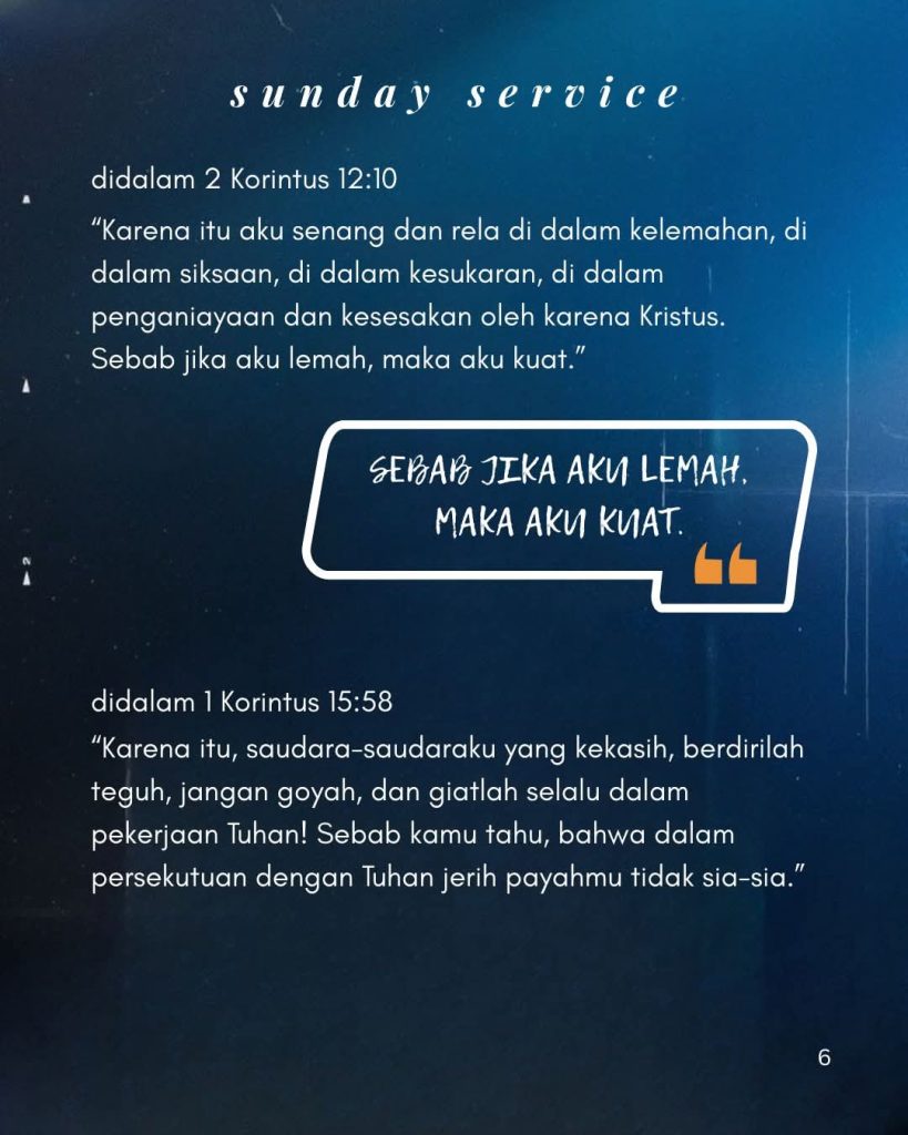 1 Korintus 15:58 (TB) berbunyi: “Karena itu, saudara-saudaraku yang kekasih, berdirilah teguh, jangan goyah, dan giatlah selalu dalam pekerjaan Tuhan! Sebab kamu tahu, bahwa dalam persekutuan dengan Tuhan jerih payahmu tidak sia-sia.” Ayat ini memotivasi umat untuk konsisten melayani Tuhan dengan keyakinan bahwa usaha mereka bermakna kekal.